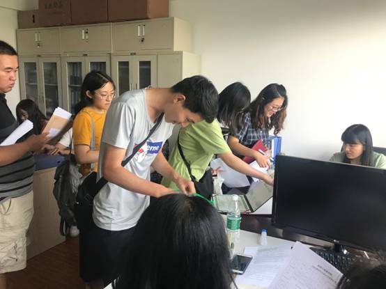 老师及同学们积极为新生们办理入学手续,解答疑惑。学校北门迎新处学院研究生会的师哥师姐们不厌其烦地给新生、家长回答着他们提出的各种问题。不少师哥师姐们主动帮着拎行李,一路谈笑风生。人头攒动,秩序井然。