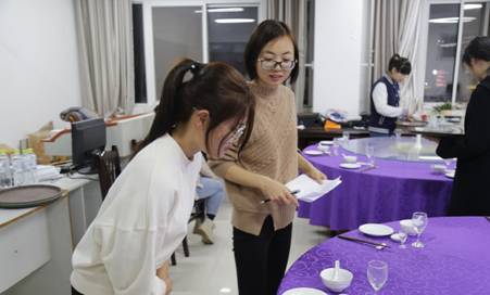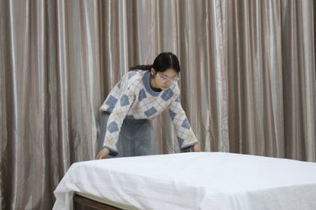 此次大学生旅游服务技能大赛分为中式铺床和中餐摆台两个项目,采用分组参赛的方式。比赛开始前,评委老师分别介绍两个项目的比赛规则及注意事项,并提醒参赛选手爱护比赛道具,严格遵守比赛规则。比赛过程中,参赛同学认真专注、动作娴熟,充分展现了我校学子扎实的专业技能功底和高超的技术水平。