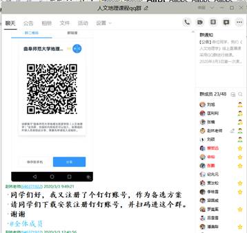 根据学校学院安排,考虑到了线上教学与线下的区别,提前2周开始准备了课件和授课资料,下载了本学期授课主题的慕课视频。基于学院安排的“网络直播+线上互动答疑+慕课辅导”为主的线上教学组织方式,考虑到不同线上直播平台的性能差异,先后安装了雨课堂、钉钉群、QQ群,并将本学期每门课程选课同学建立了课程群。由于寒假期间我举行过线上研究生组会,感觉QQ群的屏幕共享功能顺畅性、交流性更强,因此,最终选取了QQ群为主,雨课堂和钉钉群为备选的线上直播方案。同时,QQ群中同学们进行线上互动和线下交流也非常方便,我也可以随时随地的回复同学们的问题。此外,之前下载的文献、慕课视频也每次课结束后或授课前进行群共享,便于同学们下载学习。