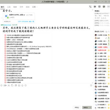考虑到部分同学居家学习,可能不具备教材或者其他专业学习资料较少等问题。一方面,我下载了由华东师范大学孔翔团队主讲的《人文地理学》和同济大学彭震伟教授主讲的《城市总体规划》慕课视频,根据进度近期上传到QQ群,供同学们观看视频学习。另一方面,我下载了大量的与专业相关的科技文献,压缩共享到QQ群,同学们可以下载阅读,拓展知识面,了解本专业前沿。比如《人文地理学》和《人文地理学基础》课程方面下载了人文地理学及其主要分支学科的研究进展文献;《区域海洋经济发展的理论与实践》研讨课给同学们提供了区域海洋经济主要分支方向的最新文献等。此外,考虑到《城市总体规划》课程的实践性较强,我将多个城市的规划文本、规划图件也在QQ群中进行了共享,让同学们对城市总体规划的规划成果形成感性认识。