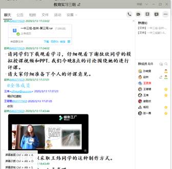 线上授课与线下授课的一个很大不同就是在师生互动方面受到一定的影响,如果只一人对着电脑屏幕直播讲课,看不到学生的表情和眼神,就没办法实时的掌握“学生哪个地方没听懂”“笔记哪个地方没记住”,时间久了,往往会使课堂节奏过快或者过慢。为了克服这一弊端,增强课堂的“互动感”和“轻松感”,每节课我都会随机抽取三名同学打开摄像头,与我一起“隔空”面对面。这样,开摄像头的同学,每一次“点头”,每一次“摇头”或者略显疑惑的表情,我都能实时看到,就能了解到“哪个地方同学们听懂了”,“哪个地方没听懂”,“哪个知识点讲的过快了?”便于课堂把握课堂节奏,实践也证明了这一点。同时,课堂上提问问题的时候,同学们可以在群内抢答,也可以直接连麦抢答,课堂气氛活跃了很多。我也会随时随机抽取没有开摄像头的同学,提问问题或者询问是否听懂或有问题,以线上提问交流的方式替代了考勤。