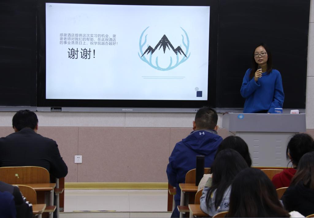 随后,蓝海酒店实习组、东方太阳城景区实习组、苏宁诺富特酒店实习组、舜和酒店实习组、自主实习小组逐一进行汇报。他们通过PPT展示,结合所学专业知识对实习过程中发现的管理方面的不足、旅游发展中的个人见解以及实习中的乐闻趣事进行总结汇报。各位指导老师从专业角度对同学们的实习成果进行精准点评,对相关专业问题进行悉心指导,同时希望同学们深入管理内部层面,从内在挖掘管理经营中存在的问题,并进行多角度分析。石峰在对报告会总结中谈到,同学们应将就此次综合实习的成果结合所学知识,形成自己的一个系统知识体系,并运用到将来的科学研究之中,不断提高自己的知识素养和实践能力,对外展现出旅游管理专业扎实的专业基础、专业技能和良好的精神风貌、专业特色。