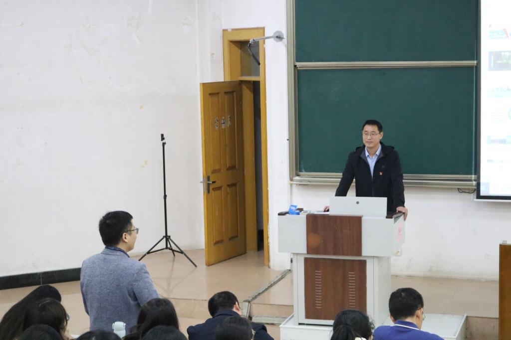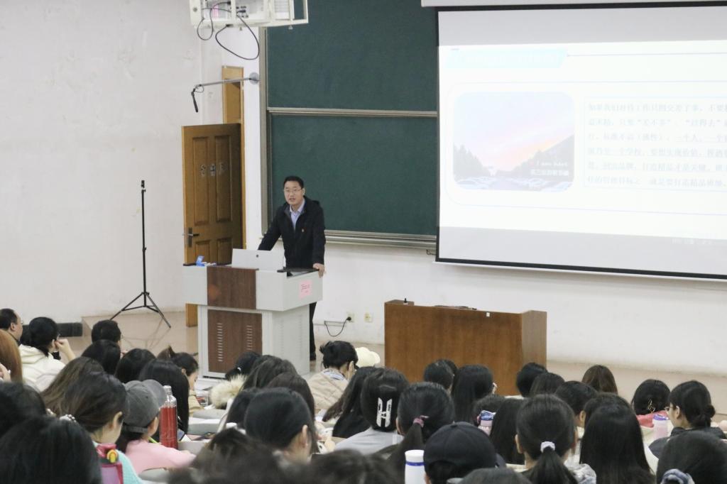 秦方老师是山东省优秀班主任、名优班主任工作室负责人、日照市教书育人楷模。会上,秦方老师以《取势、明道、优术——让班级管理绽放美丽》为主题,结合自身22年的班主任工作经验,从认识班主任、班主任工作职责、怎样做好班主任、培养和谐师生关系、班主任学习资料五个方面进行了讲解,深入浅出、循序渐进。秦老师认为,班主任是一个班的组织者、领导者和教育者,在教学活动与学生生活中起至关重要的作用。同时,对于怎样做好班主任,秦老师提出以下几点建议:勤学习、多学习,提高自身的知识储备水平;做到以身作则、言传身教;要为实现目标而锲而不舍的奋斗。此外,他还向同学们推荐了部分班主任学习文件和书籍,鼓励同学们提高工作能力,提高自身涵养。最后,秦老师勉励同学们在实践中反思,在反思中成长,运用教育智慧推动班级管理和学校德育建设的完善和发展。