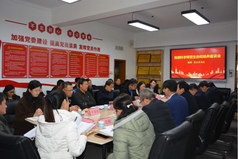 座谈会上,苏占兵记首先对各实习学校领导的到来表示热烈欢迎,并从学科建设、专业发展、师资力量、人才培养特色等方面介绍了学院发展基本情况。地理科学系主任周维国解读了地理科学(师范)专业培养方案,重点阐释教育“三习”环节的目标定位与实施流程,为校地协同培养提出了具体路径。