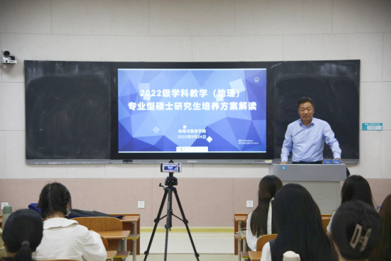 举办2022级学科教学(地理)专业型硕士研究生培养方案解读会,2022级研究生新生参加会议,学科教学(地理)硕士点负责人吕宜平副教授解读培养方案。