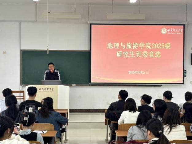 于S413教室举行2025级研究生会纳新暨班委竞选大会。地理与旅游学院研究生辅导员赵岩、2025届和2026届研究生会主席团出席会议并担任评委。会议由研究生会主席杭庆厚主持,2025级全体研究生参加。