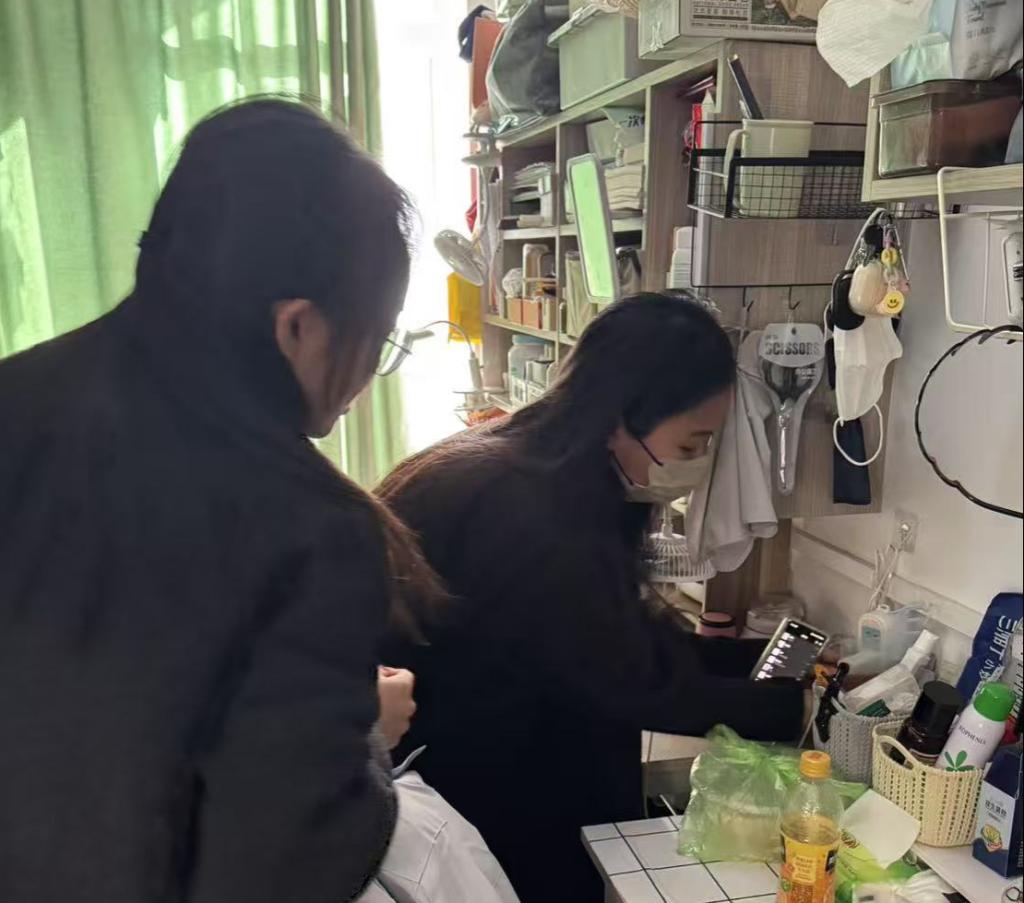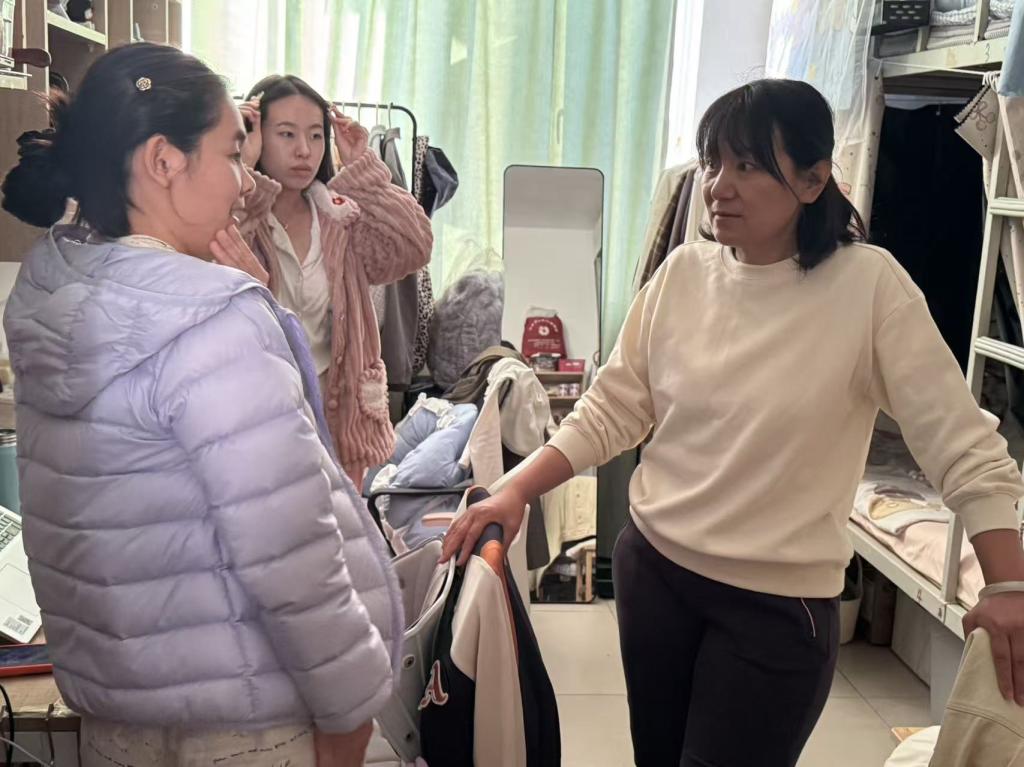 赵岩、门顺利老师逐间查看学生宿舍,重点围绕用电安全、卫生状况等环节进行排查与指导。赵岩老师着重强调,宿舍内严禁使用违规电器,务必养成“人走电断、人离插头拔”的良好习惯,门老师则明确指出需坚决杜绝私拉乱接电线等危险行为,针对部分宿舍插座摆放不规范的问题,老师当场提出了整改建议。检查中,他们既表扬了卫生整洁的宿舍,也对存在卫生问题的宿舍明确整改要求,同时提醒学生勤通风,共同营造舒适整洁的居住环境。此外,老师还与学生亲切交流,倾听宿舍生活中的需求与困惑,并对作息规律、物品收纳等细节给出建议,引导大家树立集体意识,共同维护宿舍秩序。