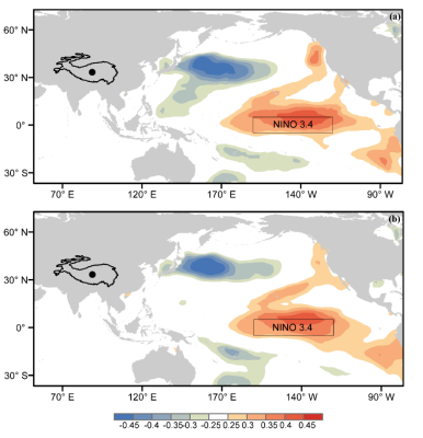 结果表明,阿拉伯海及孟加拉湾相对湿度波动是冰芯过量氘变化的主要影响因素。同时,冰芯过量氘与Niño 3.4区海表温度存在显著的相关关系。考虑到Niño 3.4区海表温度主要受ENSO循环调节,冰芯过量氘记录反映了ENSO对冰芯水汽源区相对湿度的影响。在厄尔尼诺年,沃克环流在印度洋区域对流活动受到抑制,阿拉伯海和孟加拉湾东部水汽发生辐散,相对湿度减小,同位素动力分馏增强,同时印度夏季风在厄尔尼诺年将减弱,从而在冰芯中保存较高的过量氘值;而在拉尼娜年份则相反。