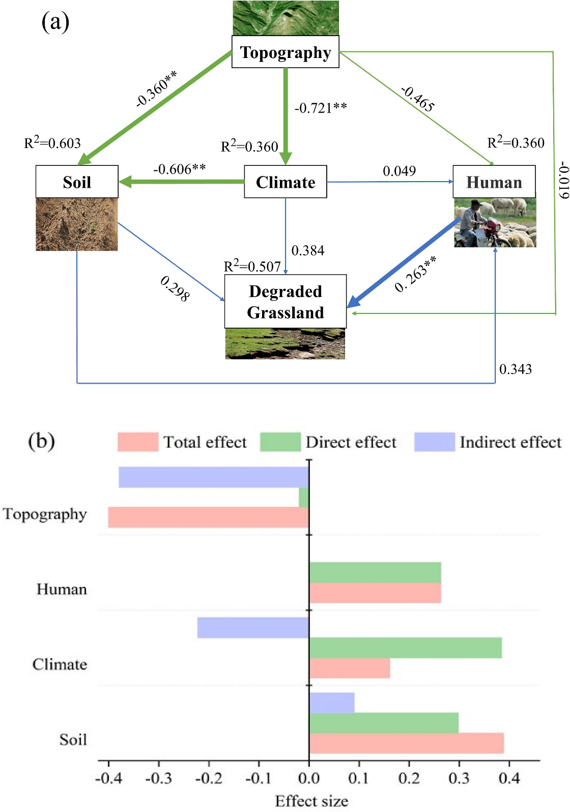 地形、人为、气候和土壤对草地退化影响的结构方程模型(a)地形、人类、气候和土壤对草地退化的直接、间接和总影响(b)。箭头的宽度与其相应路径系数的强度成正比。R2表示解释的方差比例。蓝色和绿色箭头分别表示正关系和负关系。**,P < 0.05