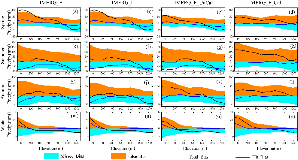 2IMERG 降水反演产品的误差与海拔高度密切相关。在春、夏和秋季,海拔低于800米时,误报偏差是主要的误差来源。而在冬季,漏报偏差主导了IMERG 降水反演产品的性能,导致降水事件的误检。