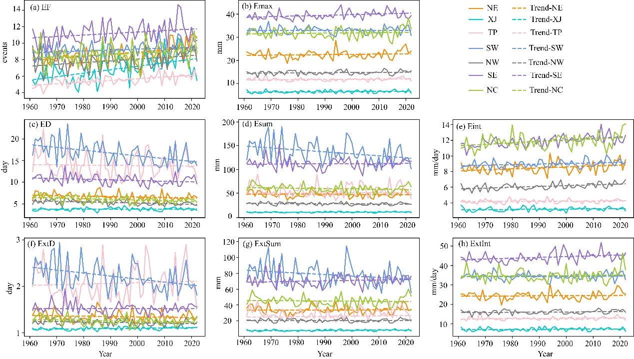 图1 1961-2022年中国大陆七个分区极端降水事件特征变量时间变化图