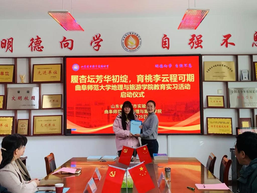在结对仪式中,许崇梅校长宣读了结对安排,实验中学地理教师向实习学生赠送了教材及办公用品。这一环节体现了实验中学对实习工作的重视与支持,也为实习学生顺利开展教学工作提供了有力保障。