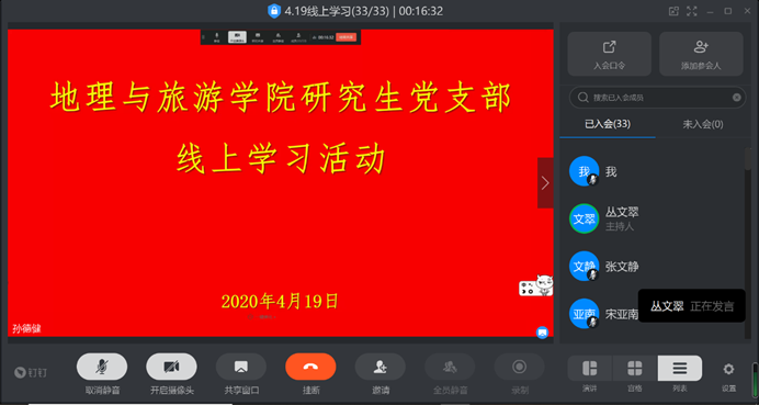 2020年4月19日19:30,电影天堂 研究生党支部开展线上学习活动,集中学习习近平总书记在“不忘初心、牢记使命”主题教育总结大会上的讲话精神,以及习近平总书记对于“全面提高依法防控依法治理能力,健全国家公共卫生应急管理体系”的讲话精神。研究生党支部书记丛文翠主持会议,组织委员孙德健同志领学,研究生党支部全体成员、积极分子代表参加学习,线上交流讨论对习近平总书记讲话精神的学习心得与体会。