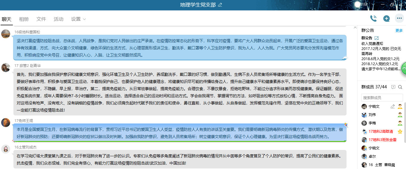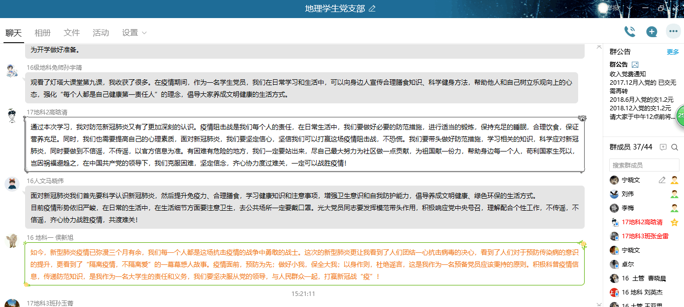 刘伟指出:各党员都在为当前疫情防控贡献出自己力所能及的力量。参与社区执勤、志愿服务、自觉捐款捐物,面对严峻的形势和考验,表现出共产党员冲锋在前的勇气和责任担当。现在疫情防控取得阶段性胜利,但不可掉以轻心。应继续发挥党员先锋作用,令行禁止,严格要求。教工党员坚守岗位,创新工作思路,加强线上管理;学生党员要发挥骨干作用,立足各自班级配合老师完成毕业生工作。全体党员要上下齐心,听从党的指挥,服从组织安排,为国家走出困境尽自己的应有之力。