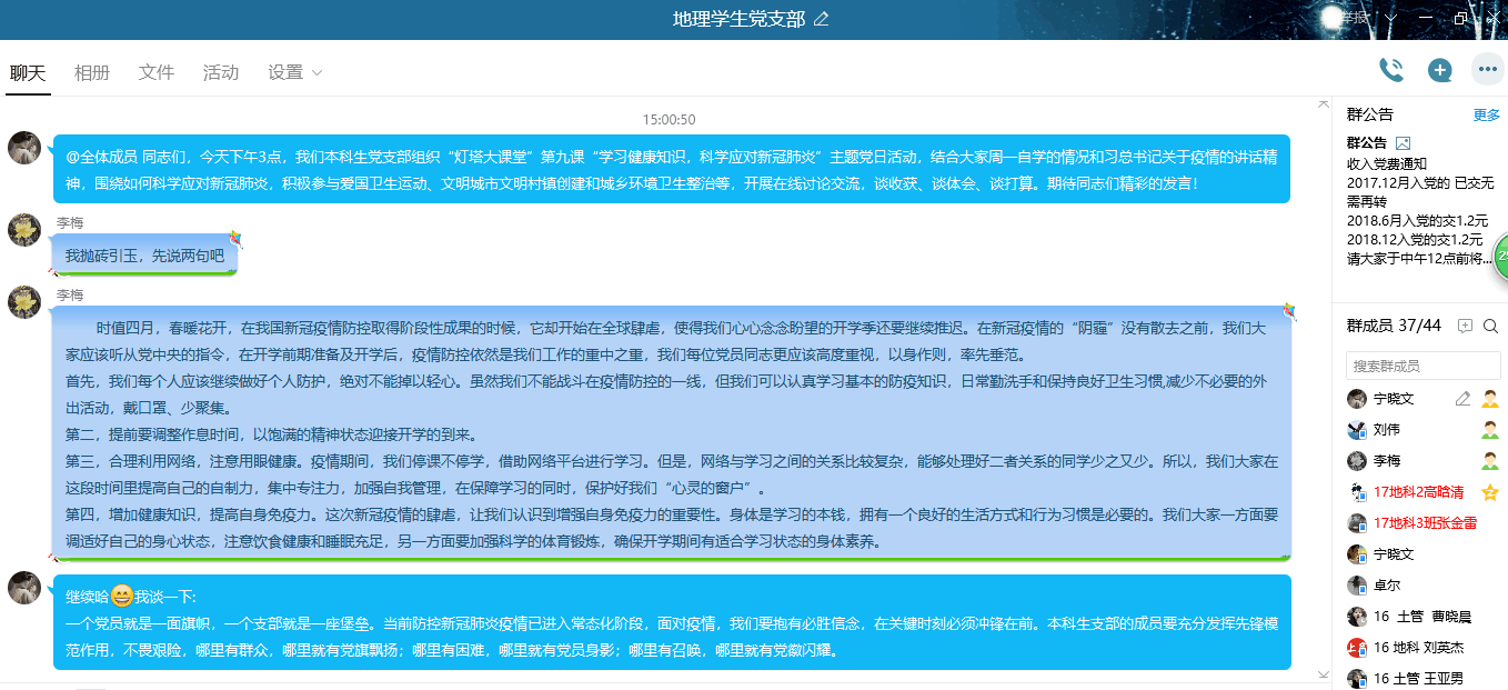 会议伊始,李梅表示:疫情防控仍然是重中之重,身为党员更应高度重视、以身作则,听从党中央指令。并提出“做好个人防范、调整作息时间、合理利用网络、丰富健康知识”四点要求,希望党员能够以积极饱满的状态迎接开学。会上,各党员针对自身学习进度,结合当前疫情防控状况,轮流进行发言。曹晓晨表示:通过学习了解到目前最重要的是将专家讲解的各种知识落到实处,在日常生活中不仅自身注意各方面管理,也要向身边人传播正确知识,科学认识新冠肺炎,提升免疫力,合理膳食,做好心理疏导。除此之外针对慢性病管理和中医中药方面做好知识储备,在今后以身践行,增强卫生意识和自我防护能力,养成文明健康、绿色环保的生活方式。李雁钊则表示:当前国际疫情持续蔓延、我国防范疫情输入压力不断加大,考虑自身及他人的安全仍需采取积极措施。在这场疫情阻击战中,全国各地涌现出大量无私无畏、可亲可敬、英勇奋战的时代人物,作为党员更应该向他们学习,积极配合学校防控工作,按照学校要求居家学习。面对疫情舆论,增强是非意识,保持清醒头脑,全面贯彻落实党中央决策部署,做到不信谣、不传谣。