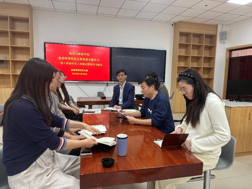 3月26日下午,旅游管理系党支部在S109室召开会议,启动深入贯彻中央八项规定精神学习教育,全体党员参加了学习。