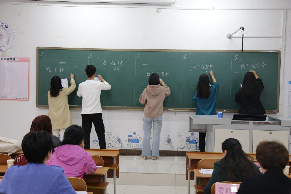 本次大赛的比赛内容包括钢笔字、毛笔字、粉笔字三部分,参赛者在比赛前期认真练习,比赛时他们个个精神专注,尽情展现书写功底,粉笔字书写规范、整洁,版面设计美观;钢笔字下笔刚劲有力,笔画清楚、字距匀称,笔画流畅分布均匀;毛笔字运笔正确,起笔行笔收笔清楚,字体结构合理。不同的书法形式向观众展现出不同的精彩。评委老师认真比较观察进行打分,最终,梁纪涛、崔杨获粉笔字一等奖,谭力山、农爱婷获毛笔字一等奖,李凯迪、刘瑞媛获钢笔字一等奖。