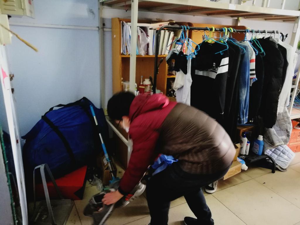 在安置好同学们的贵重物品后,他又返回宿舍协助社区人员清扫阳台杂物,耗时6天,将本学院全部宿舍改造前的预备工作完成,为下一步宿舍改造工作的顺利进行起到推动作用。
