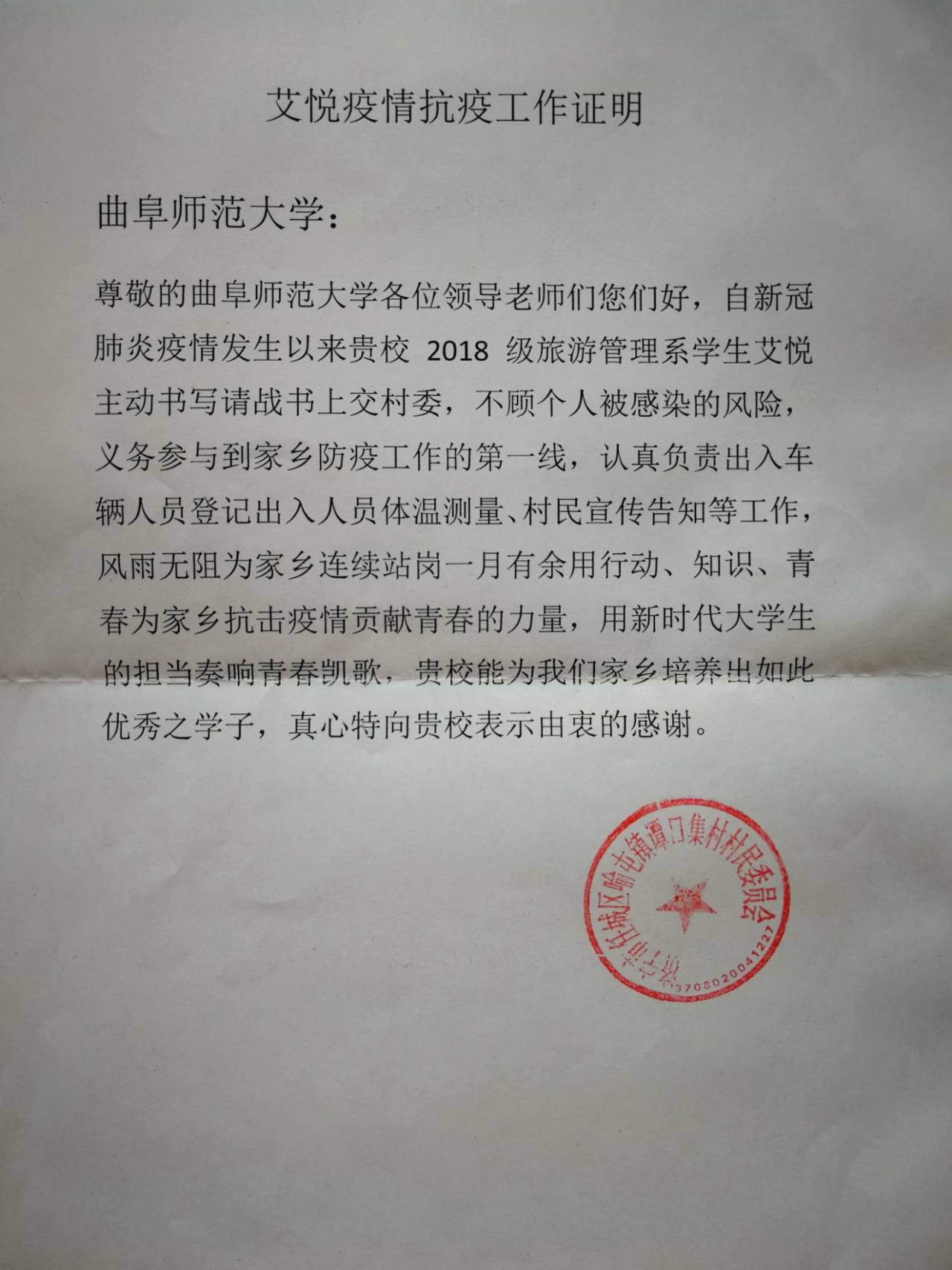 二月的天气虽已回暖,但农村的气温依然较低,可是这并不能动摇艾悦抗击疫情的决心。她没有丝毫退缩、对进入非本村庄的车辆,无论大小,一概进行消毒,绝不漏查一人一车。艾悦感慨道:“正值国家危难关头,作为一名大学生,我们更应该承担起自己的使命,肩负起自己的责任,用行动、用知识、用青春抗击疫情,回馈家乡,报答社会。虽然我个人的力量是渺小的,但只要有千千万万个和我一样的人,就能汇成巨大的力量,疫情并不是不可战胜的,只要我们心连心,携手共同进退,相信我们终将战胜疫情!”
