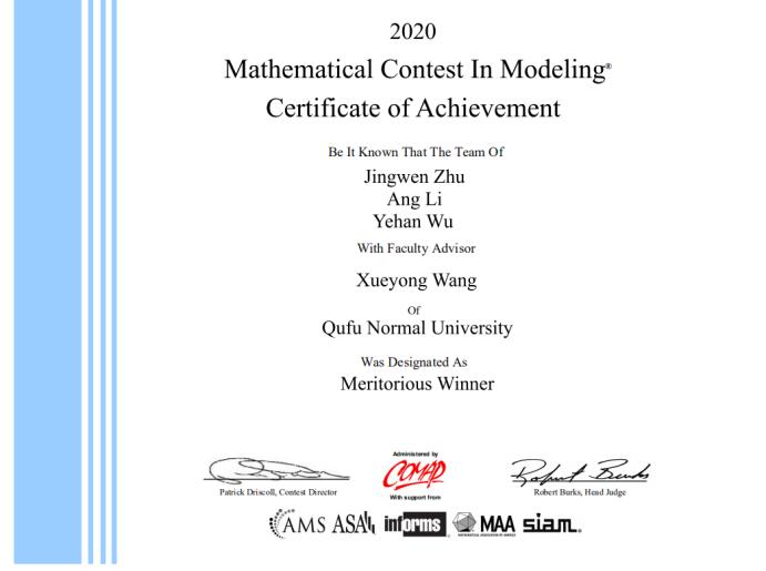 2018级学子喜获佳绩,吴叶涵获得美国大学生数学竞赛一等奖(M)奖,屈文熙获得美国大学生数学建模竞赛二等奖(H)奖。