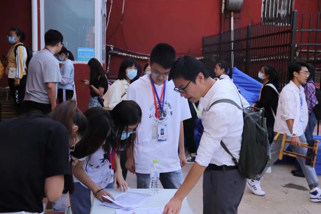 在四季花园宿舍外的迎新点,党委副书记刘伟、团委书记宁晓文与工作人员们亲切交谈,询问新生报到情况,并勉励大家将电影天堂