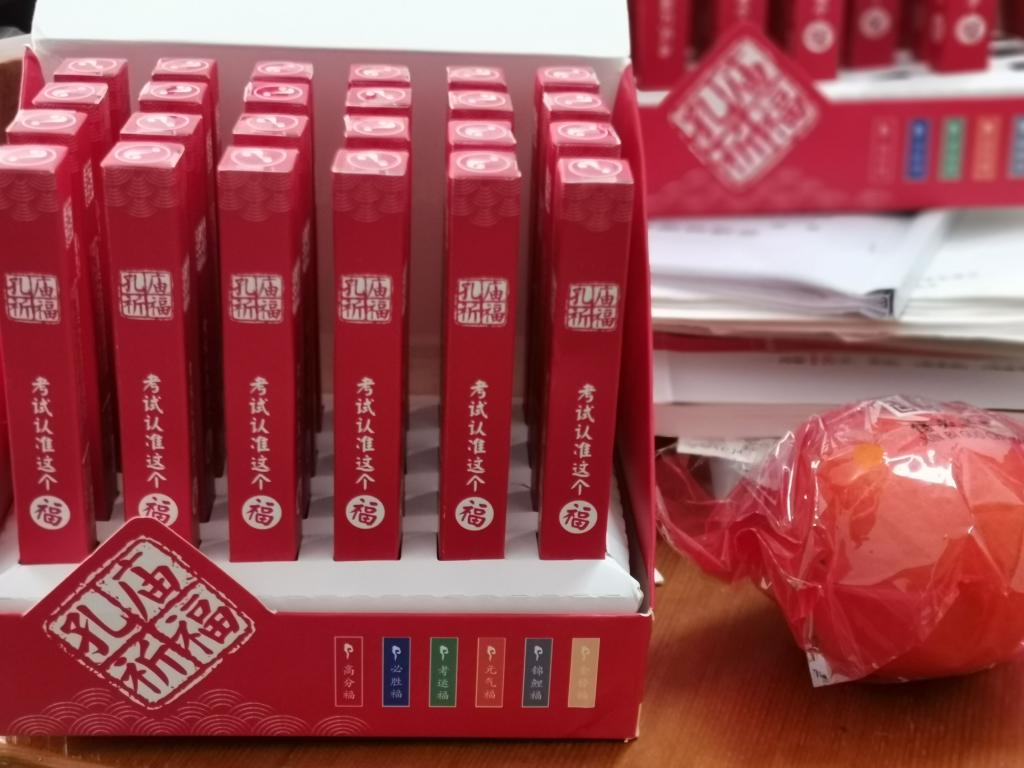 老师们为考研学子分发象征心想事“橙”的幸运橙子,并请学子们抽取孔庙祈福“盲盒”,盲盒中分别有象征高分福、必胜福、考运福、元气福、锦鲤福、金榜福的六种中性笔,表达电影天堂