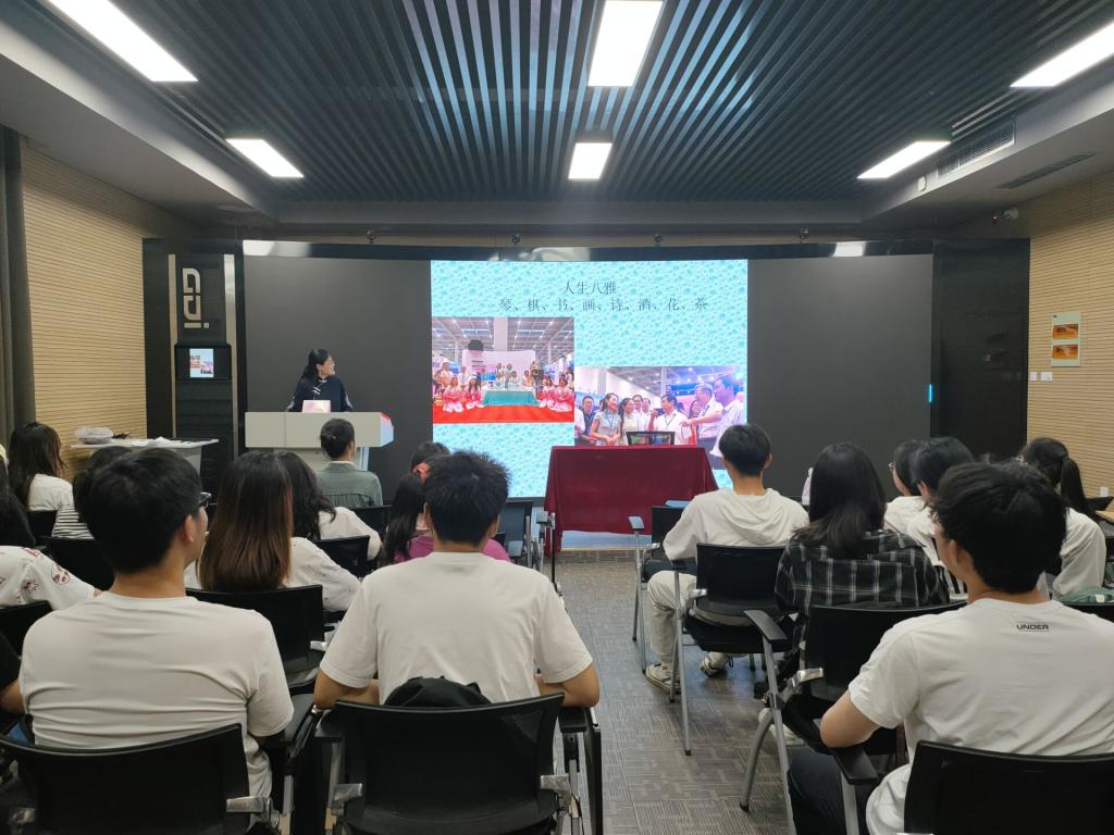 主题沙龙上,马倩从中国八雅入手,分享了自己关于琴茶文化的经历与心得。谈到茶,老师从其大学的求学经历讲起,分享了她从误解茶、重识茶、再到热爱茶的心路历程。现场热烈互动,探讨中国茶叶的分类与品种,讨论同学们喝过的茶叶;讲解了茶的相关知识,并亲自示范了茶艺基本礼仪,让同学们大开眼界。