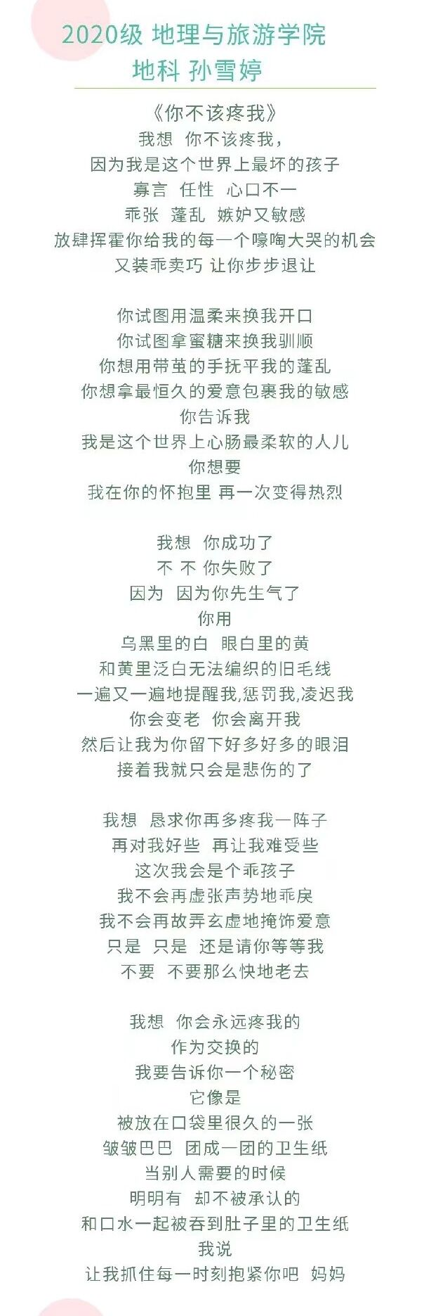 20级地理科学(师范)五班孙雪婷荣获三等奖,20级旅游管理班陈德华获得校级优秀奖。下面是她们的精彩作品: