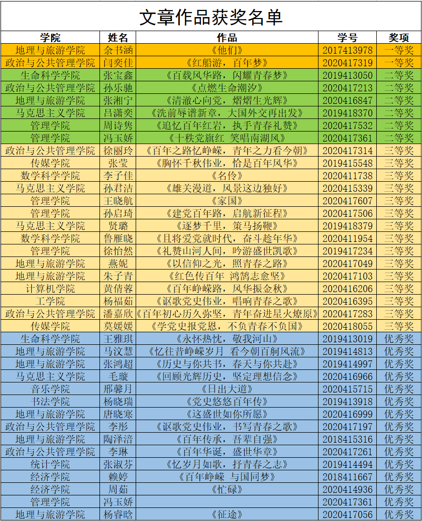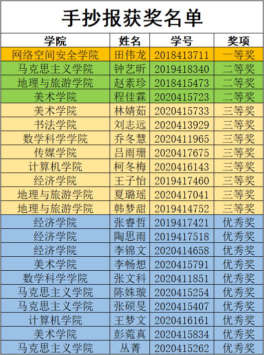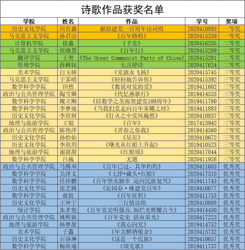 根据《校团委关于开展庆祝建党100周年系列活动的方案》(曲师大团字 〔2021〕12号)精神,评审工作小组认真组织审核和评审,共评出文章类作品一等奖2名、二等奖6名、三等奖15名、优秀奖15名;诗歌类作品一等奖2名、二等奖4名、三等奖13名、优秀奖12名;手抄报类作品一等奖1名、二等奖3名、三等奖8名、优秀奖10名。本次活动的开展,深入推动党史学习教育持续走深走实,营造浓厚的学习氛围,增强同学们学习能力,使同学们对党史有更深刻的理解,以更加昂扬的精神迎接建党百年。