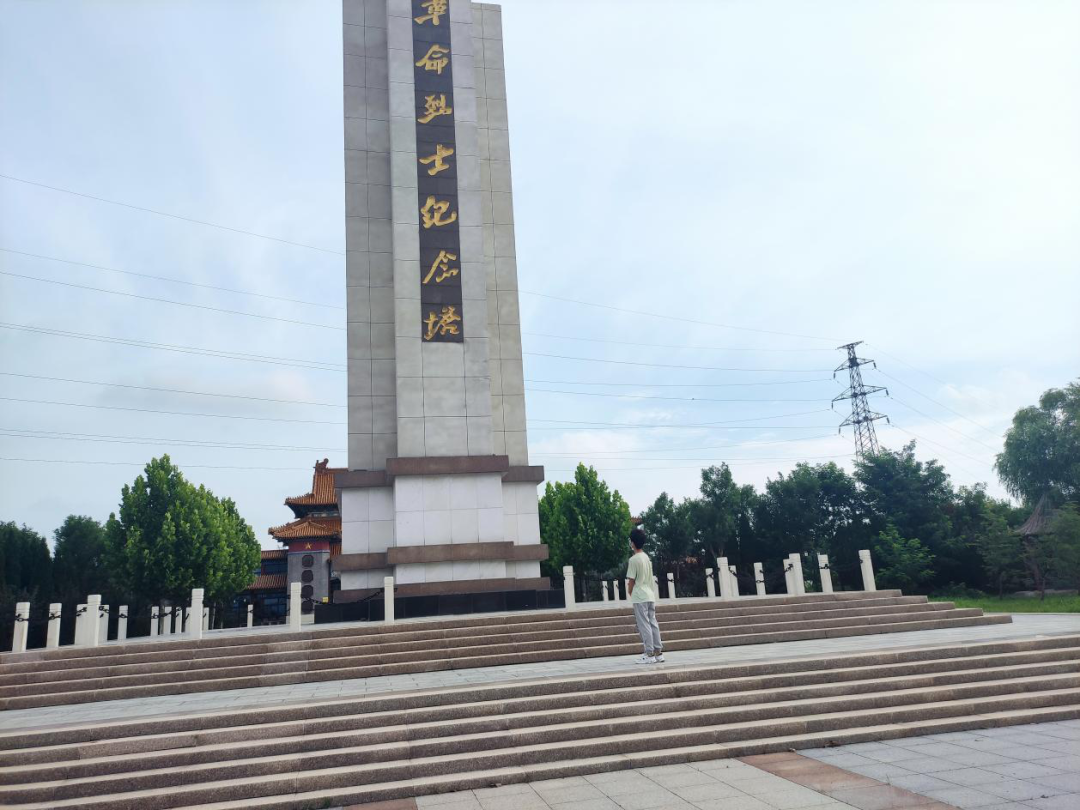 一踏入烈士陵园,映入眼帘的便是一座高大威严的革命烈士纪念塔。陵园充满了肃穆庄重的氛围,身处其中,我们满怀敬畏之心。当实践队员注视着纪念塔时,就好像穿越时空,回到那个战乱的年代与英雄对视,他们的目光一如既往的坚定且有力,仿佛想把那些发生在战场上的故事讲给队员们听,把那些还没来得及和家人告别的话说完。纪念塔周围还围绕着洁白的石柱与青葱的树木,更加衬托出纪念塔的威严与庄重。