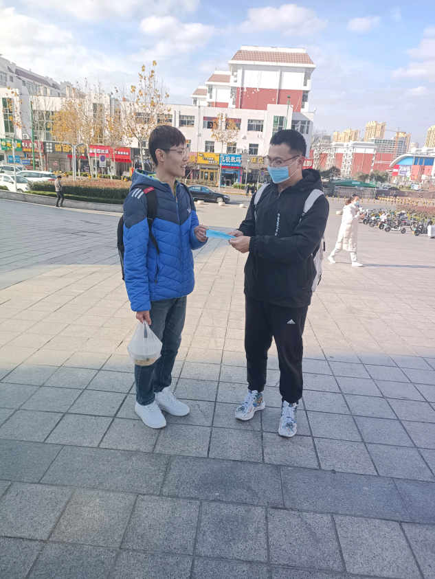 为响应疫情期间“人人戴口罩”的号召,国际交流部部长孙孟杰通过在园区门口给忘记带口罩的同学发放口罩,以及通过与未戴口罩的同学进行谈话等措施,呼吁同学们要时时刻刻戴好口罩,以确保自身的生命安全,为疫情防控做出自己的贡献。