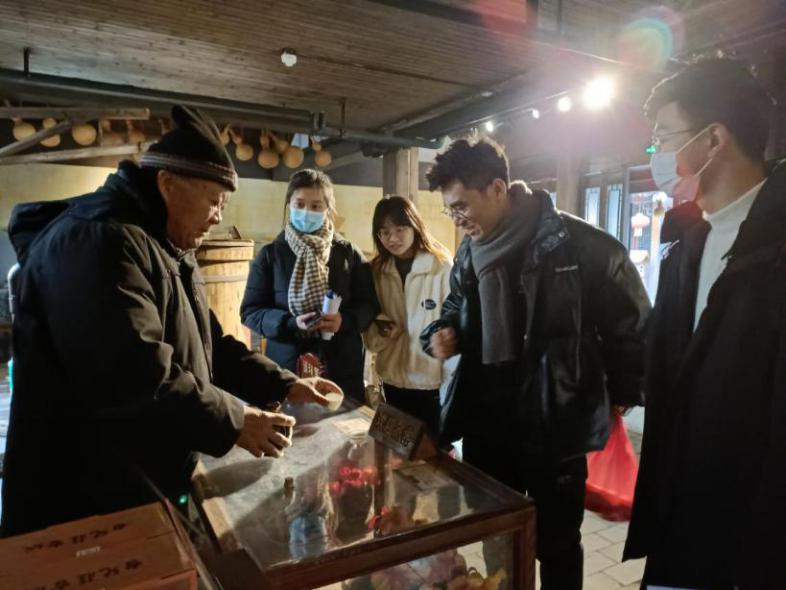 午后,实地调研组来到运河酒文化展馆——道昇酒坊。台儿庄运河古城酒文化源远流长,距今已有三千多年的酿酒史。展馆一楼是酒坊,采用场景复原、实物陈列、图文说明和多媒体表现技术等方法,展示白酒从生产加工到展卖经营的全过程,带领游客一起体验真实可感的台儿庄运河酒文化。空气里弥漫着淡淡的酒香,酿酒师热心介绍着台儿庄古城特产“四粮液”的生产过程。据酿酒师介绍,四粮液由高粱、小麦、大米、豌豆这四种粮食经过复杂的工序生产出来的,因此而得名。展馆二楼为运河酒器博览馆,馆内陈列了不同时期不同类型的酒器多达500余件。道昇酒坊,不愧是一所向游客展现酒文化独特魅力的展馆。