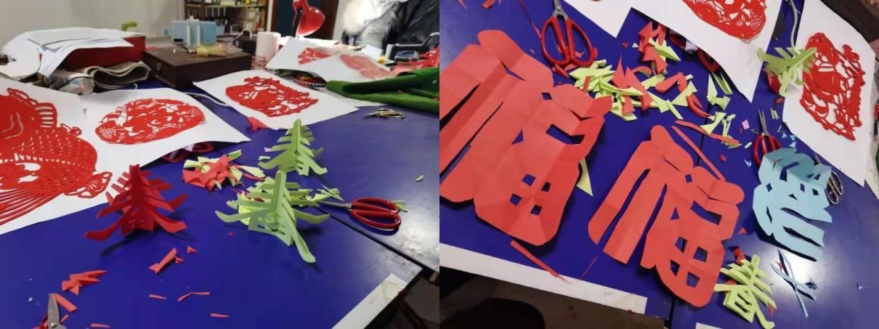 随后,在进行了简单参观之后,我们也尝试和老师学习一些简单剪纸。老师先是带我们了解了剪刀和一些工具的用法,过程中,我们学习到,就算是看起来简简单单的一把剪刀,也有很灵巧地运用方法,在剪纸之前也有做很多准备工作要做,虽然过程中我们时常出现一些问题,但在老师的耐心引导下,我们也渐渐走上正轨。