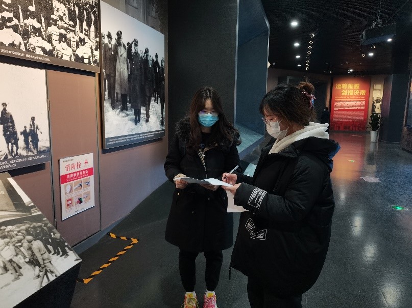 本次活动我们准备了关于团史知识的调查问卷,并在济南市解放阁、山东省博物馆和济南战役纪念馆多个地点进行采访。进入到山东省博物馆,我发现很多父母带着自己的孩子在假期来参观博物馆,尤其一楼的山东革命展厅,里面陈列着许多革命时期存留下来的资料、衣物等。我看着一排排带着斑驳血迹的战衣,不由得从心底产生一种敬意,他们超越地区,超越年龄,超越身份,都勇往直前的向前冲,让我不禁感叹组织的核心凝聚力。