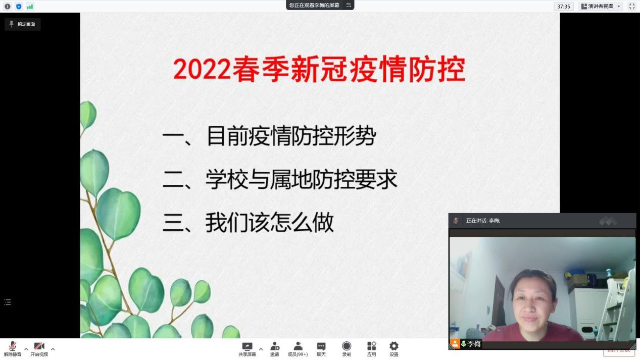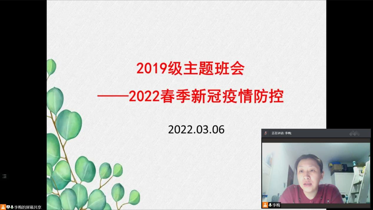 2019级于2022年3月6日召开“2022春季新冠疫情防控”线上主题班会,本次线上班会由2019级辅导员李梅主持,2019级全体同学参加。