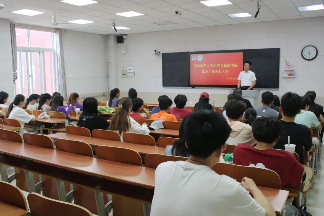 于S207召开2024年体育工作表彰大会。本次会议由体育部部长郭兴哲主持,党委副书记刘伟、分管老师陈鑫出席,全体运动员参加。
