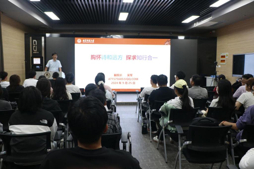 “平台+模块的专业课程体系”的优势,并以幽默的口吻向同学们全面介绍了这个体系,使同学们提前了解和熟悉。他鼓励2024级新生能够全面发展自己的能力,在求学之路上披荆斩棘,不断追求知行合一。