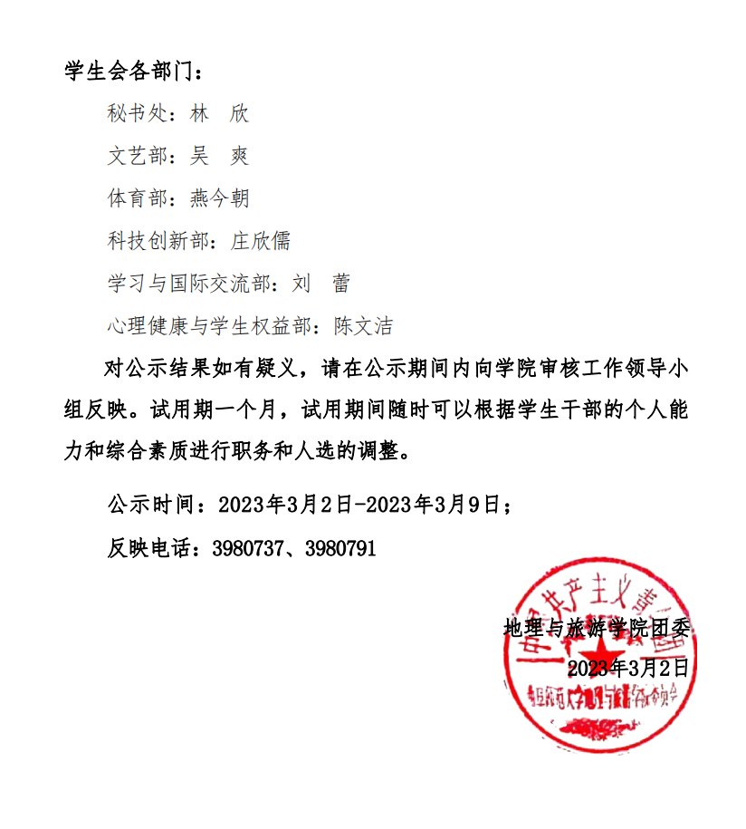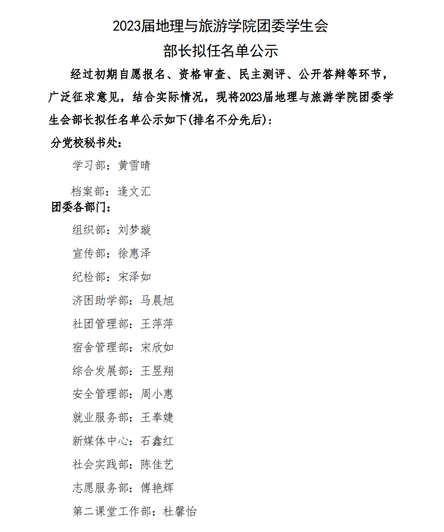2023届电影天堂 团委学生会部长拟任名单公示