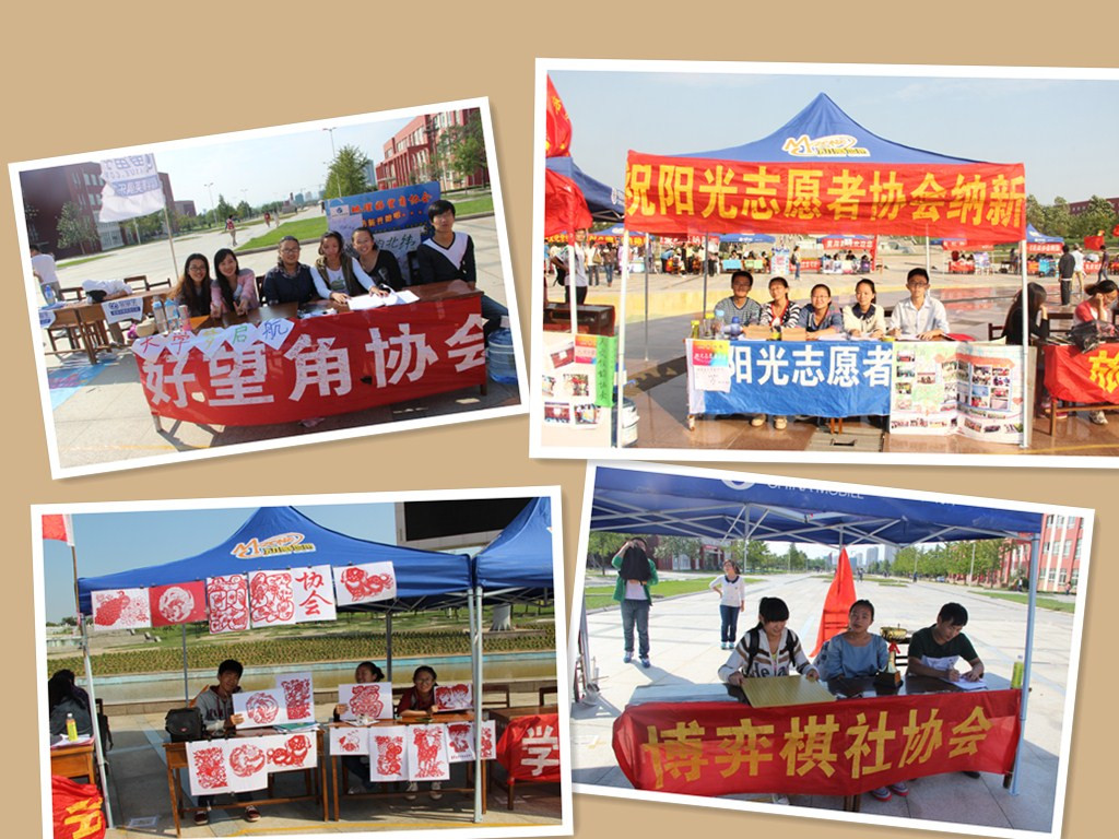 社团纳新于2013年9月23日在日月广场开始正式开始。纳新将持续三天,剪纸协会,好望角协会,阳光志愿者协会,红蚂蚁协会,习之书社,交谊舞协会,旅游协会,博弈棋社等进行纳新。电影天堂