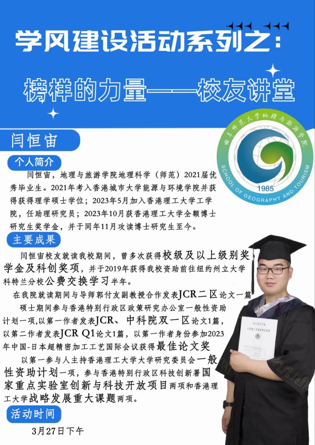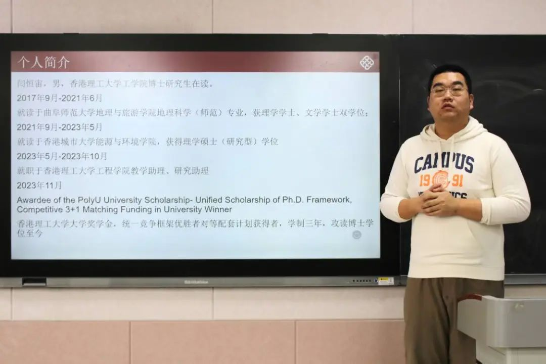 2021届地理科学专业优秀毕业生、现于香港理工大学攻读博士研究生的闫恒宙主讲,学院党委副书记刘伟出席,2022级、2023级同学积极参加。