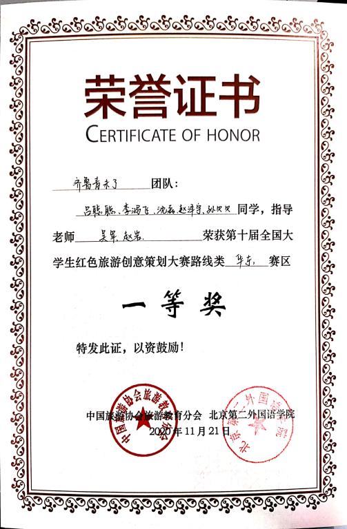 在这次比赛中我收获很大,这是一段与老师和队友们一起并肩战斗的美好经历,我会一直铭记在心。在这段经历中,我有机会将书本上所学的知识用于实践,在策划旅游线路中也认识到了自己思维方式和理论知识的不足之处,对我以后的学习有非常大的帮助。另外,团队坚持不懈,迎难而上的氛围也深深感染着我,鼓励着我在学习的路上勇往直前。