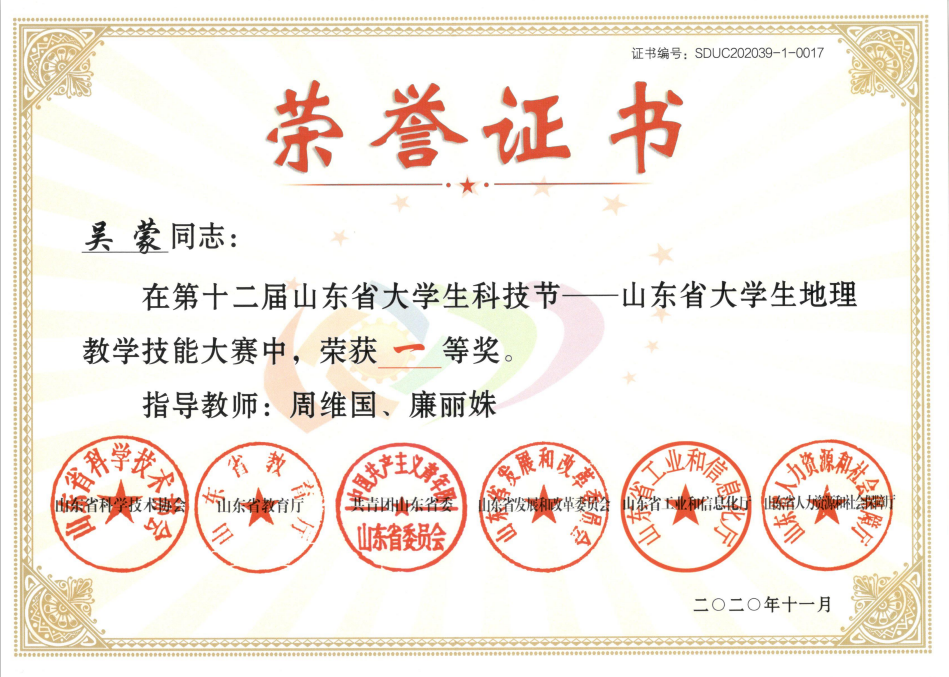 获奖情况:2020年山东省大学生地理教学技能大赛一等奖