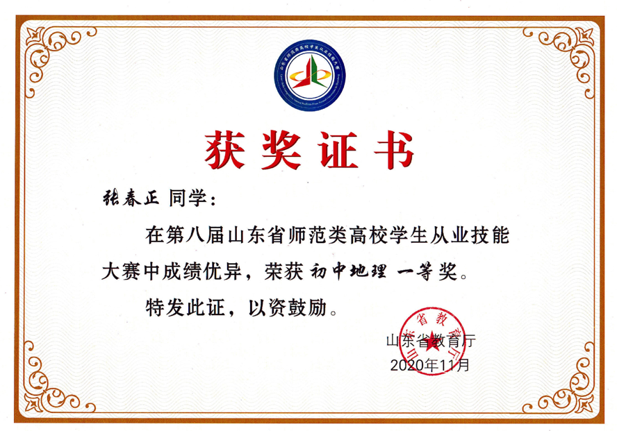 获奖情况第八届山东省师范类高校学生从业技能大赛初中组地理一等奖