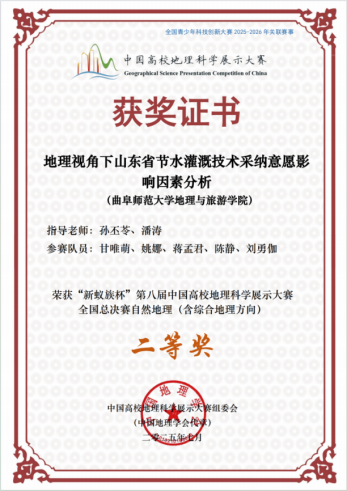 孙丕苓、潘涛老师指导,学生甘唯萌、姚娜、蒋孟君、陈静、刘勇伽完成的作品《地理视角下山东省节水灌溉技术采纳意愿影响因素分析》获得自然地理(含综合地理方向)组二等奖;孙丕苓老师指导,李珂、董一冉、冯宇佳、李冉、李纪琰完成的作品《基于生计分化视角的乡村农户生活用能模式及影响因素研究》获得人文地理组二等奖。李珂、李冉、冯宇佳三位同学作为参赛代表队伍接受央视频的采访,充分彰显了电影天堂