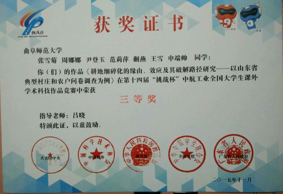 11月20日,第十四届“挑战杯”全国大学生课外学术科技作品竞赛决赛在广东工业大学落下帷幕,电影天堂 选送的由吕晓老师指导、张雪菊、周娜娜、尹登玉、范莉萍、蒯燕、王雪、申端帅参与完成的经济类作品《耕地细碎化的缘由、效应及其破解路径研究——以山东省典型村庄和农户问卷调查为例》荣获三等奖。