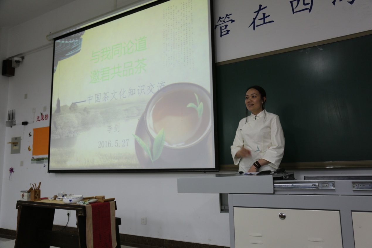 李剑老师首先讲述茶文化的发展历史,让同学们领略到中国博大精深的传统文化,修身养性,品茗清心。然后,从茶之用,茶之类,茶之艺,茶之具等角度全面阐述了茶文化。最后,李老师在悠扬古朴的音乐伴奏下,进行了精彩的茶艺表演,举手投足皆顺应音乐的起承转合,散发出优雅温柔的气质,给人以美的享受。
