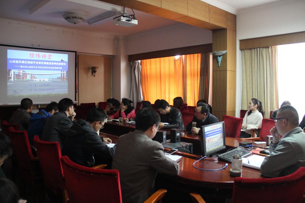 新引进青年教师、北师大人文地理学博士赵林作了题为《山岳型风景区旅游开发居民满意度影响机制研究——兼论泰山旅游开发中的社区居民权益的保障问题》的报告,讲座由人文地理教研室主任刘志刚老师主持,学院院长代合治、副院长王慧出席,部分教师、研究生等40余人参加。