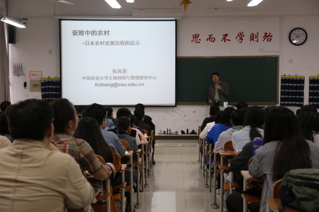 张凤荣教授首先以日本上胜町为例,从其社会经济状况与发展态势等方面分析农村再生模式。随后张教授深入剖析了我国农村发展现况,结合日本农村发展历程对我国农村土地整治提出了一些看法,表达了自己对我国农村土地整治的独到见解。在最后的交流环节中,张教授与老师们热烈的探讨引发了同学们的阵阵掌声。