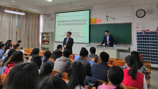 做了题为“多源数据反演长江经济带城市土地扩展与人类活动相互关系及相互作用”的学术报告。报告会由院长张全景教授主持,学院相关专业教师、研究生和本科生共一百余人参加了报告会。