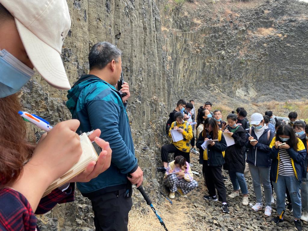 此次自然地理实习涉及地质学、植物地理学、水文学等专业课程。在为期两天的野外实习中,专业指导教师带领同学们考察昌乐乔官镇远古火山地质公园的玄武岩,参观临朐山旺古生物化石博物馆的远古动植物化石,观察鲁山国家森林公园的植被垂直分层现象、沂源鲁山溶洞群的石钟乳及沂源水库保护区。在实习过程中,学院组织的学科教学团队循循善诱,细致讲解,将课堂理论与实习中出现的地理事物充分结合,使同学们充分了解和认识到地理环境的整体性和差异性以及地理要素的关联性。集合讲解结束后,同学们团结协作,以小组为单位进行自由探索,对老师布置的专业问题进行探究。他们利用地质锤等工具对岩石进行勘探,辨识岩石种类,描述当地岩性产状,探索地层蕴含的环境演变信息,通过小组讨论对植被垂直分层现象的原因加以解释说明。
